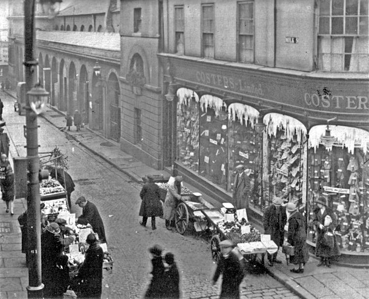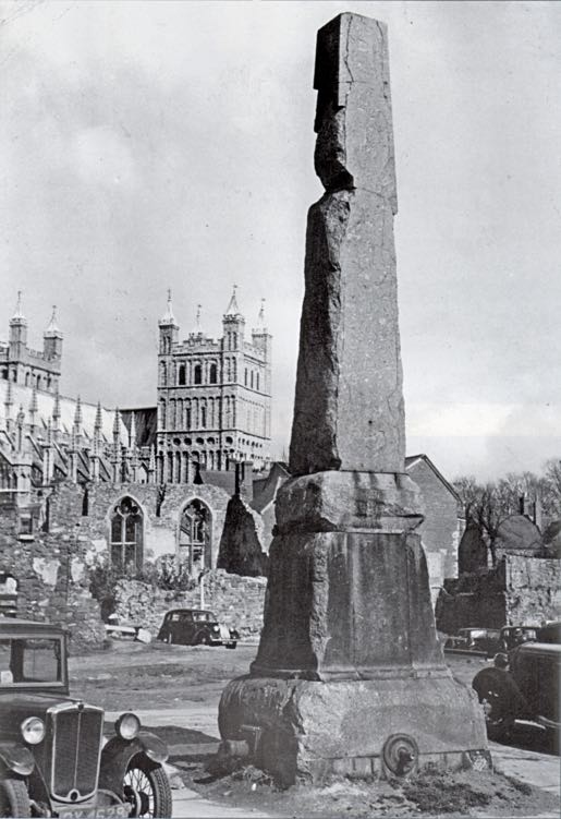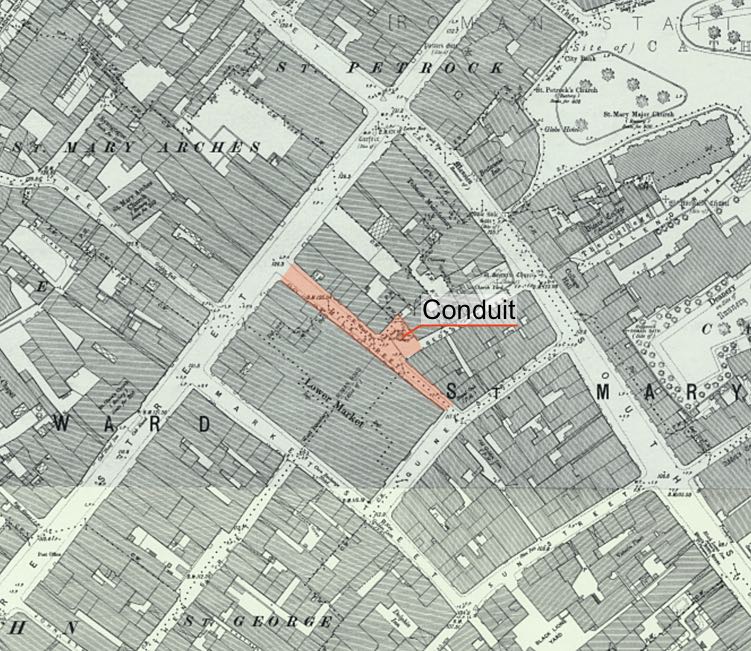 After the construction of the Lower Market and loss of the top of Butchers Row, in the 1830s, Milk Street led to Guinea Street, which formed the top of a T. In the small square formed at the junction of Milk Street and George Street, in the 1905 map, was placed a stone obelisk that served as a water conduit; it replaced the old public water supply that was positioned in South Street, in front of the College of Vicars Annuellers. Here, locals would line up with their buckets, jugs and pans, as water, from St Sidwells would trickle from the spout.
