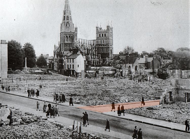 In May 1942 the bombing of the top of Fore Street and South Street saw all the buildings in Milk Street destroyed, including the Lower Market. When the ruins of Milk Street were cleared, the remains of No 8 were found to date from 1320. It had been a simple building, two storeys high, with a cellar. All that remained of the timber frame and volcanic stone building, were the solid walls. Another tragic loss caused by the blitz. The rebuilding after the war saw the street reduced to the narrow alley next to George's Market we see today–the parking area is an extension of George Street.