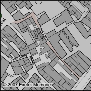 John Gendall illustrated the arch, that led into St Nicholas Priory, for Thomas Shapter's report on the Exeter cholera outbreak of 1832. In it, he showed the pump, which had been installed by a local named Lawler shortly before the outbreak - the many wells of Exeter were blamed for the spread of the cholera, although subsequent research has found that they were not to blame. One of the small gardens on Mint Lane has a well, which can be seen by peering over the wall. It was also a source of pure water for the inhabitants of Mint Lane.. Some occupants of buildings in Mint Lane in 1897.