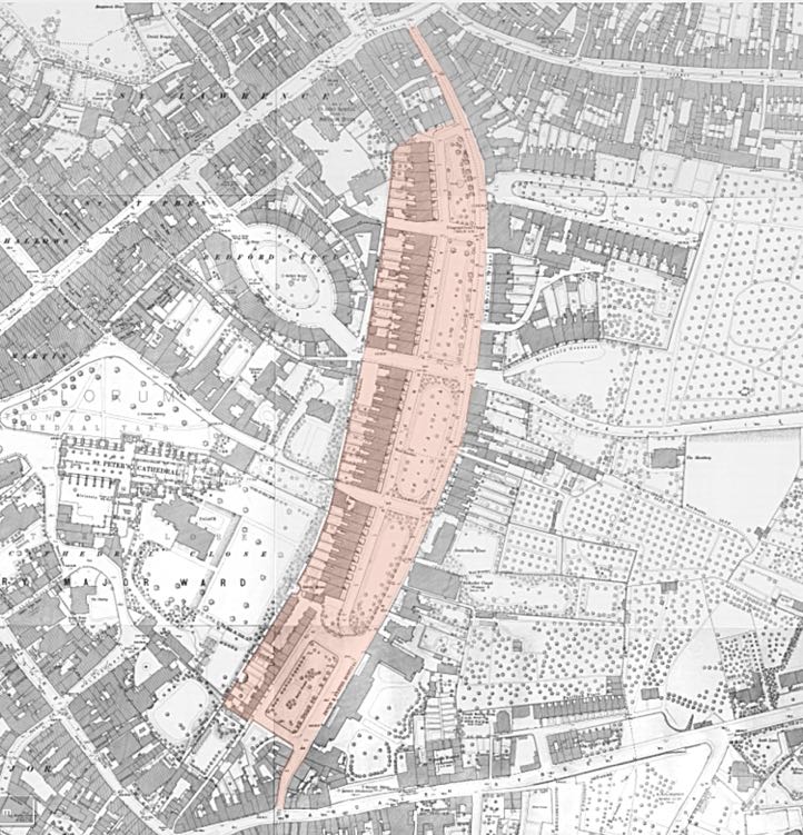 At its southern end, the (Royal) Devon and Exeter Hospital was built in 1742, on land donated by John Tuckfield, that had formerly been used as a tilt yard and a public space for fairs and horse shows.