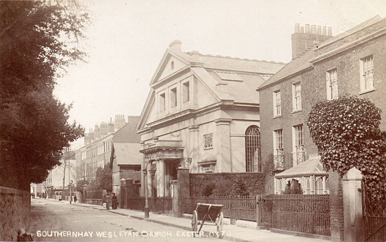 The Southernhay Congregational Church on the corner of Dixs Field. The white house to the left was the birthplace of the Rev Baring Gould, who is noted for penning 'Onward Christian Soldiers'.