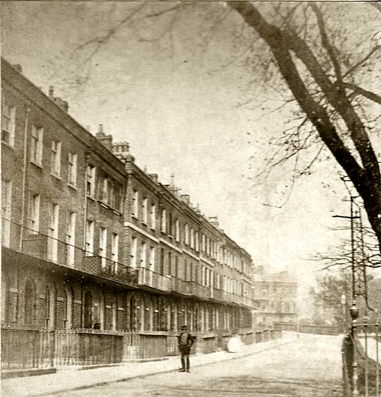 "Southernhay.-The upper green was an open space, a resort for children to play, also used at fairs and other times for menageries, shows, &c.; the horse fair the other side of the road, (Chichester Place) extending from Dix's Field to the Barnfield, also opposite on one site of No. 2 green. I have seen as many as three hundred tied up awaiting purchasers. It was almost impassable and dangerous with the restlessness, and trying the speed and action of the animals. No. 4, the lower green, was a rough piece of ground, used by children playing; the site of the houses opposite was a deep incline used for depositing refuse from old buildings, &c. At the end, in front of these large old trees, was also used for menageries, shows, &c. In front of the Hospital (which was built in 1741) and down to Magdalen-street road, widened 1827."