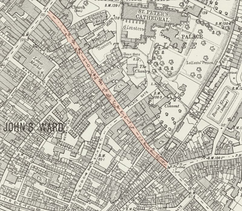 hill dropping from the Cathedral down Palace Gate, dating from the 13th