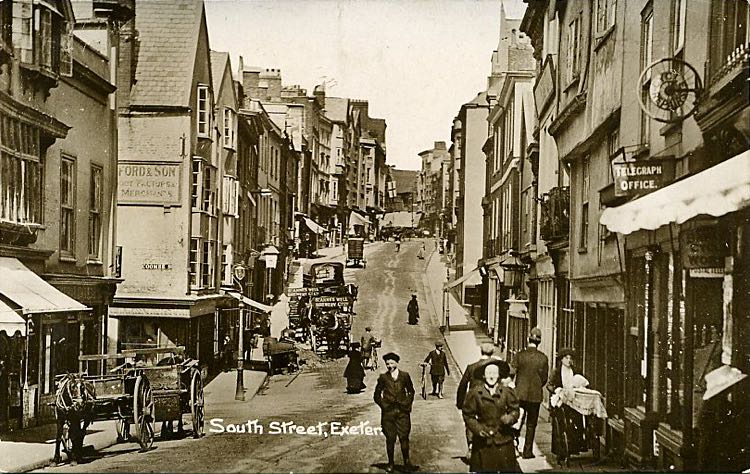 One of Exeter's three wool markets was situated in the Shambles. South Gate Street was the main route into the city from London and the east, and was much narrower than the present thoroughfare.