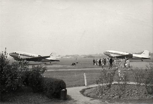Jersey Airline 'Dakotas' are on the tarmac, while passenegers embark on