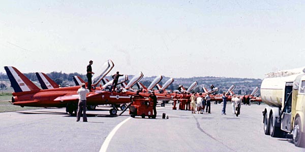The Red Arrows lined up on the tarmac for fuelling during the 1977