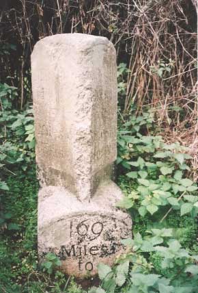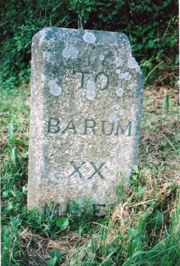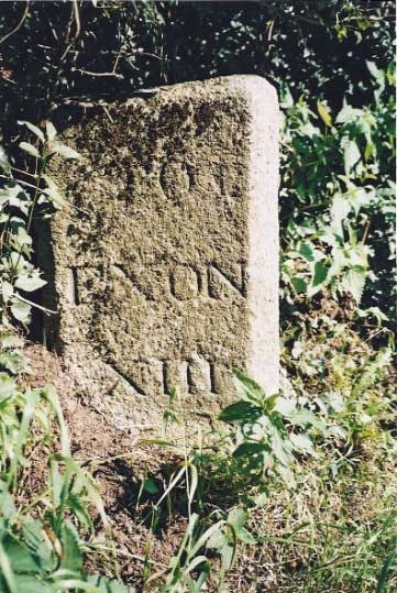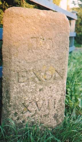More of the plain milestones can be seen on old roads towards Plymouth through Shillingford, Ide and Dunchideock, whilst there is a run of neglected stones on the rural road to Stockleigh Pomeroy. Only two survive on the A377 as far as Crediton and there are others out to Tiverton on both old and new (A396) routes and into Cullompton via Bradninch. There are also a few survivors along the old road from Crediton to Labbetts Cross near Chawleigh one of which at the hamlet of Frost near Morchard Bishop shows mileage recorded in Roman numerals and Exeter as 'Exon' a medieval Latin alternative. Several stones had this version inscribed sometimes with an interchange of Latin and English names on the same route along with a mix of Roman and Arabic numbers.