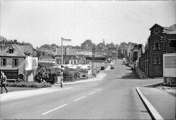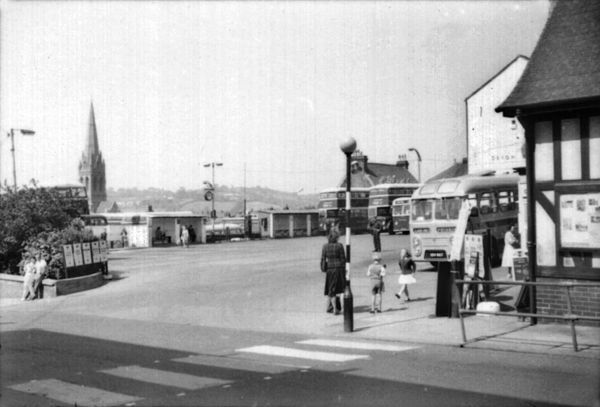 The bus station in the late 1950s - the Information Bureau is the timber framed building. Photo Dick Passmore.