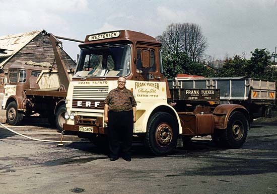 John Braund, stood in front of his Frank Tucker ERF tractor unit, at the Frank Tucker yard which was located in Heavitree. The lorry had a Gardiner 240 engine. John was a regular driver on the A303 up to London, taking loads to Coca Cola (Brimsdown, North East London), New Containers (Amersham, from Dartmouth), or Westbrick 'Bricks' (from either Pinhoe or Brixton, Plymouth to Woodford, North London). On the return journey, he would always bring back pallets of Tate and Lyle sugar from the factory in Silvertown, East London. Courtesy of Tom Braund.