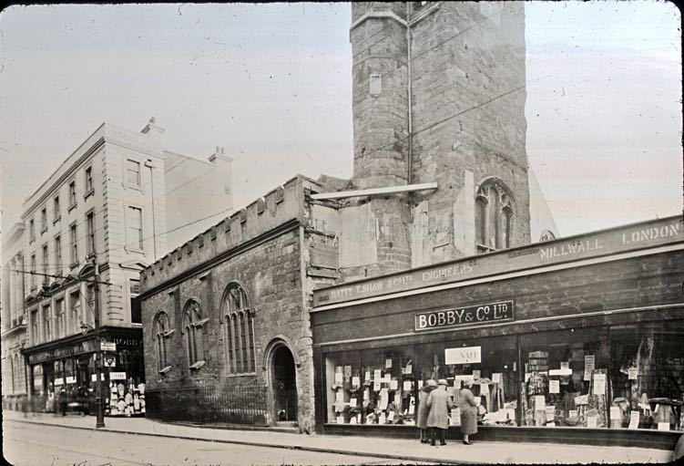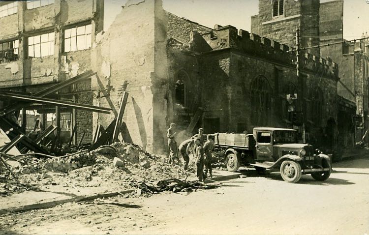 "The fire guards at Messrs Bobby and Co, were on duty on the roof and were successfully dealing with the I.B.s (incendiary bombs) but were continually driven off the roof by machine gun fire. Between this menace and the flames spreading across the street they were unable to cope with both difficulties and the flames starting from Messrs. Bobby's spread to Messrs. Deller's Cafe through the portion of the building above Lloyds Bank".