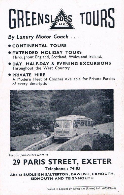 Sources - Greenslades history on their website. City Council guide books. A history of Exeter public transport. Fleet History of Greenslades Tours Ltd, published by The PSV Circle.