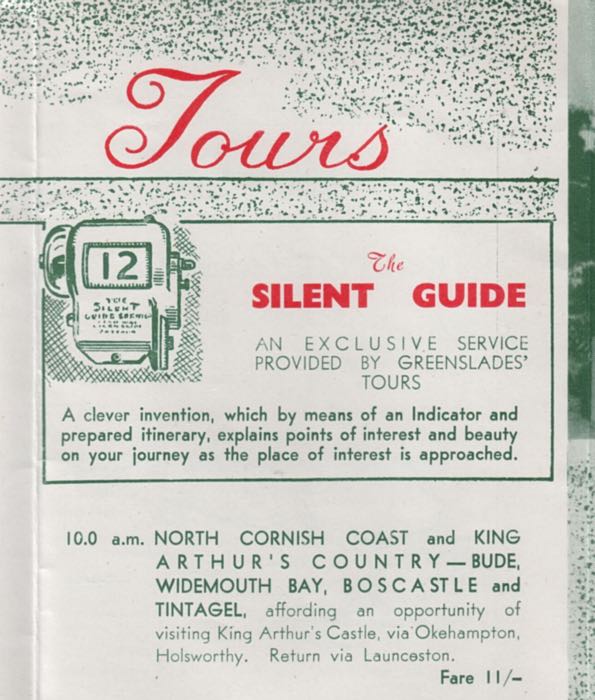 A feature that Greenslades offered, from the 1920's to after the Second War, was the so called 'Silent Guide' on their coaches. Each passenger who booked one of their day trips would be given a leaflet, with numbered paragraphs, describing the features and country side through which the coach was passing. When the coach passed a particular beauty spot or interesting building, the driver would display the number for that place on the front, interior bulkhead, and the passenger could read the notes for the place.