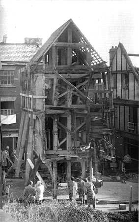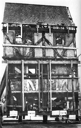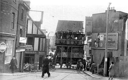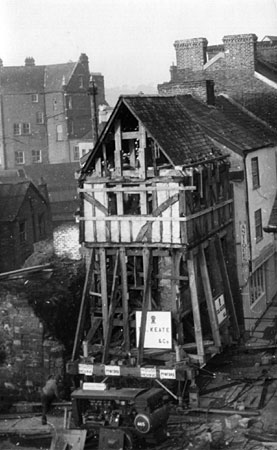 A London company headed by Mr Fordham Pryke, aided by local company, T D Keate, was contracted to move the house about 70m up from its site on the corner of Edmund Street and Frog Street to a new position by the old West Gate, at the bottom of West Street. It took several weeks to prepare the house for the move; the timber framework of the house was criss-crossed with 10 tons of strengthening timbers and iron wheels placed at each corner attached to hydraulic jacks, the whole, weighing 21 tons. No iron bolts, screws or supports were used against the original timbers, to prevent damage. The structure was top heavy, so during the move, the jacks would be used to ensure that it was always kept upright, with frequent checks made using spirit levels.